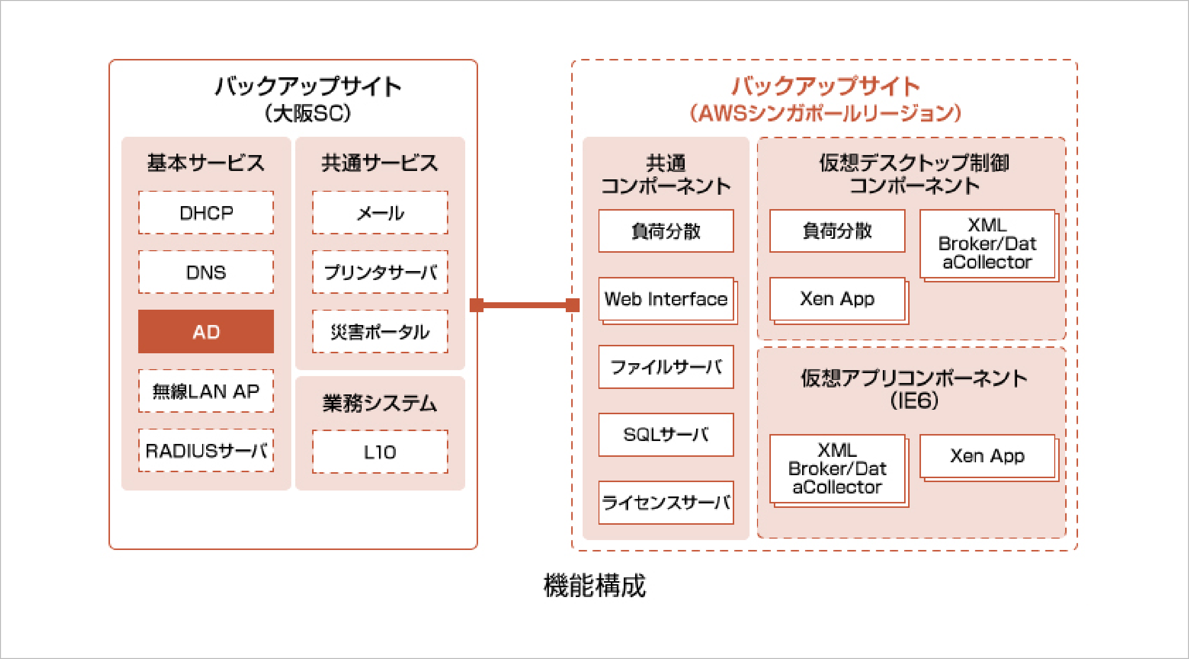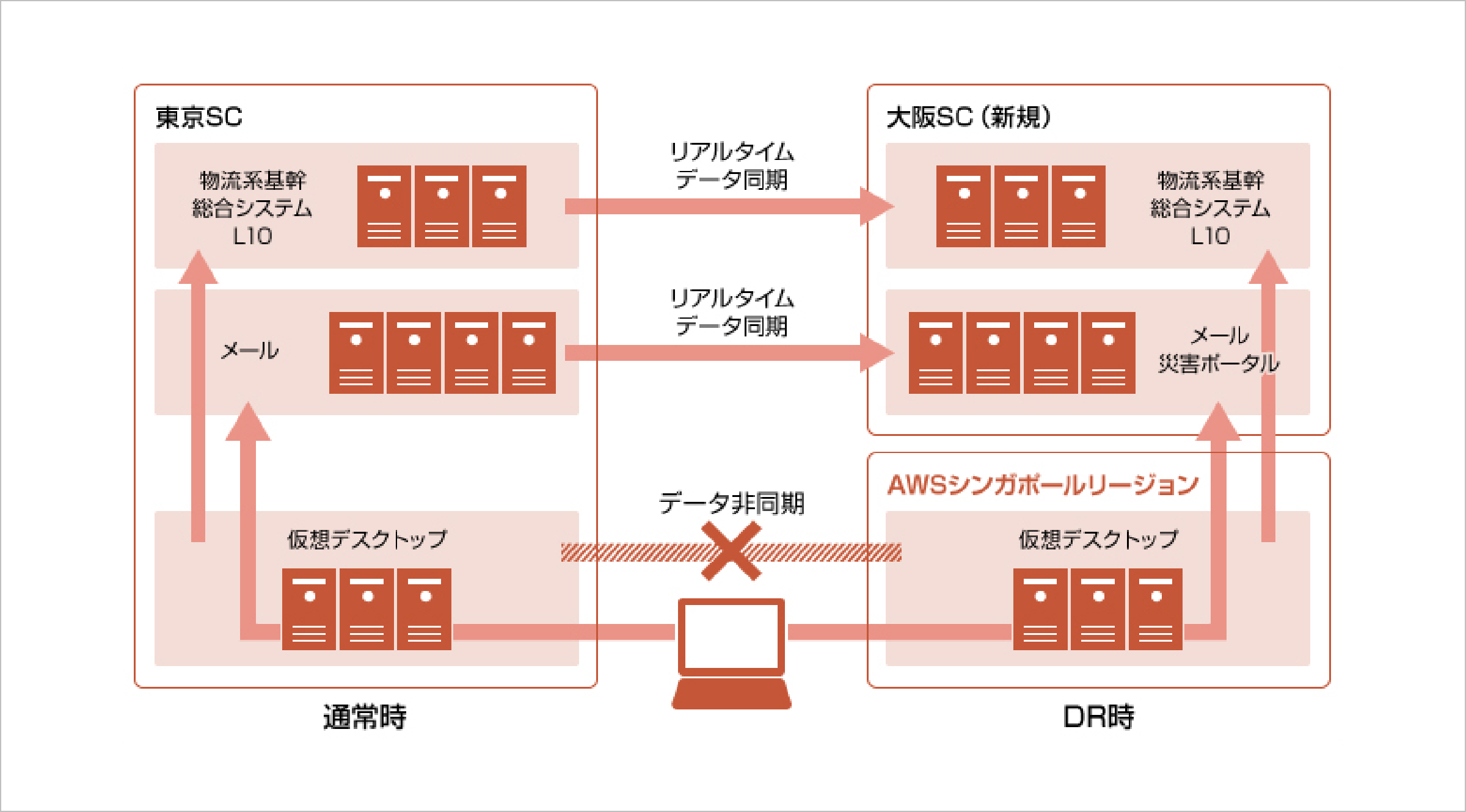 当初、DR(ディザスタリカバリ)対策はDR用のデータセンターである大阪SCにオンプレミスで構築する前提で検討が進んでいました。しかし、BCP対策コストをもっと抜本的に削減したい(特に通常運用におけるコストをミニマム化したい)と考え、仮想デスクトップのDRはAWS(Amazon Web Services)を活用しました。