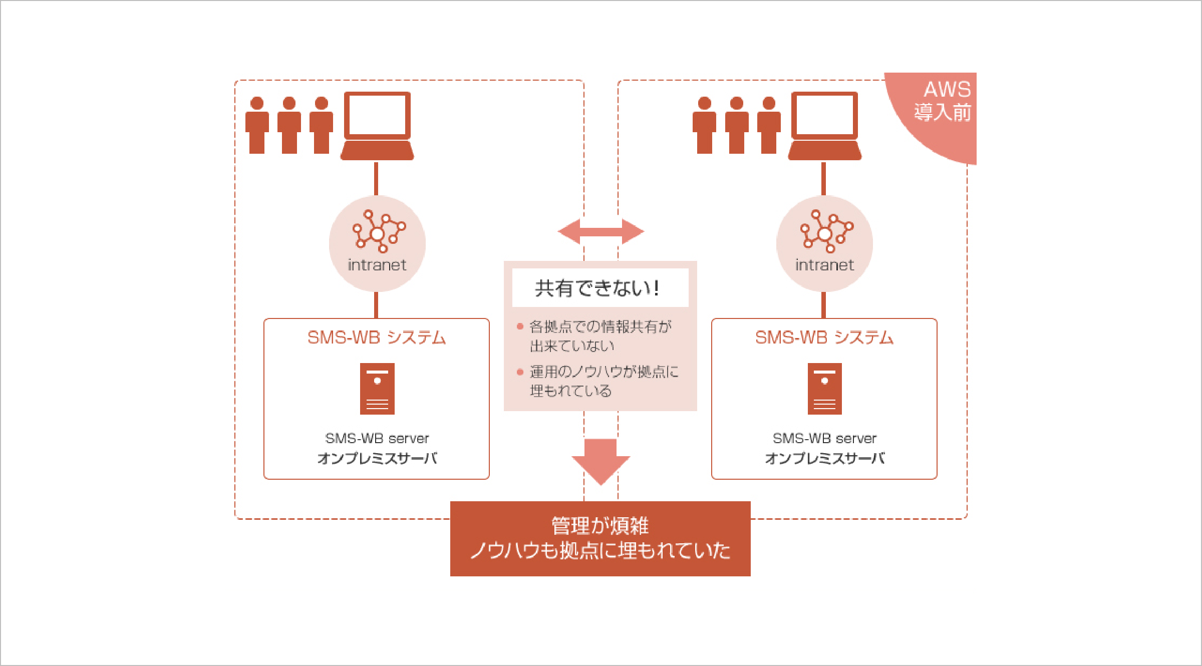 顧客への運用サービス提供のために、各担当でSMSワークベンチ(※)(以下「SMS-WB」)という独自運用ツールを利用しており、これまではオンプレミス上で稼動させていました。