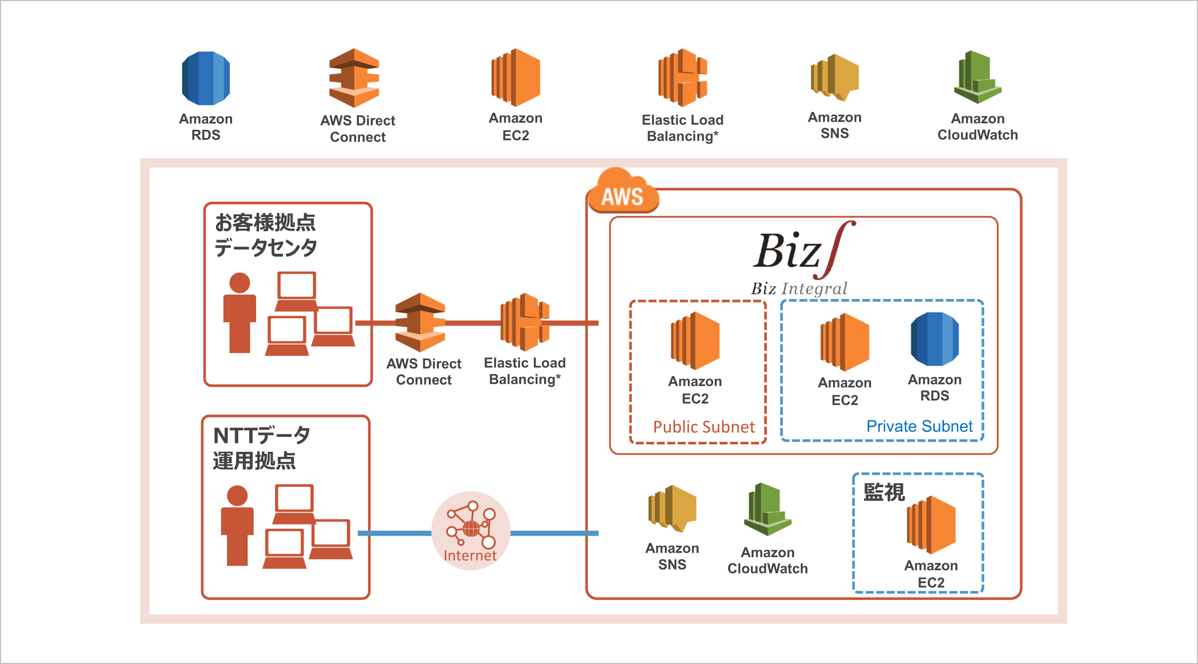 本プロジェクトでは更改後の「Biz∫」の基盤として、アマゾンウェブサービス(以下、AWS)を活用しました。
